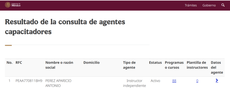 La veracidad y registro de estos cursos y habilidades lo puede revisar en la siguiente liga: https://agentes.stps.gob.mx/Buscador/BuscadorAgentesProgramas.aspx